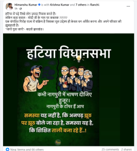 सोशल मीडिया पर सक्रिय और खांटी राजनीतिज्ञ हिमांशु कुमार तो साफ कहते है कि “कभी नागपुरी में भाषण दीजिए, हुजूर। नागपुरी के टॉपर हैं आप। समस्या यह नहीं है कि अनपढ़ झूठ पर झूठ बोले जा रहा है, समस्या यह है कि शिक्षित ताली बजा रहे हैं।” हिमांशु कुमार यह भी कहते है कि आखिर हटिया में पढ़े लिखे लोग ज्यादा निवास करते हैं। लेकिन बड़ा सवाल – मोदी जी के नाम पर कब तक? एक संगठित गिरोह राज्य में सक्रिय है। जिसका मूल उद्देश्य ही केवल धन अर्जित करना और अपने परिवार की खुशहाली है. जागो युवा जागो – बदलो झारखण्ड।