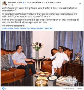 हिमांशु तो एक फोटो देकर राजद विधायक दल के नेता सुरेश पासवान के विधानसभा में दिये गये उस बयान का जोरदार समर्थन करते हैं कि पूरे विधायक आवास के फर्नीचर के लिए दस लाख रुपये होनी चाहिए। वे कहते है कि सुरेश पासवान ने गलत क्या मांगा? हटिया के विधायक के घर के केवल एक सोफा की कीमत इस फोटो को देखकर लगाया जा सकता है। इसकी कीमत दस लाख भी हो सकता है। केवल एक सोफा अगर लाखों का हो सकता है तो सुरेश पासवान ने गलत क्या मांगा? अभी विधायक को मात्र तीन लाख रुपये मिलते हैं और एक अबुआ आवास का कीमत दो लाख।