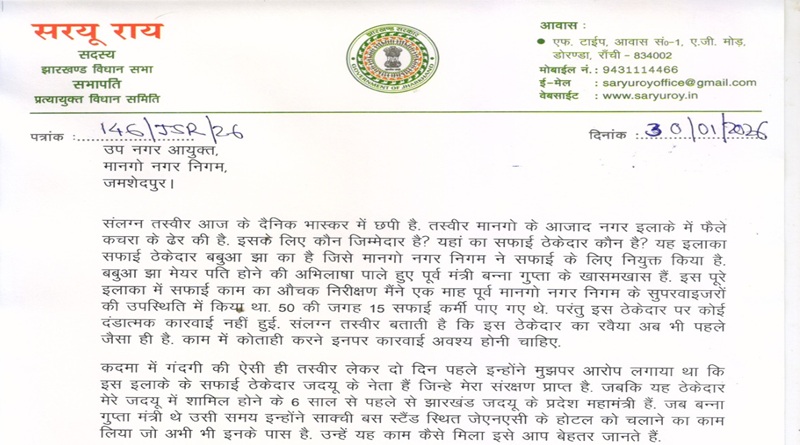 जमशेदपुर पश्चिम के विधायक सरयू राय ने मानगो नगर निगम के उप नगर आयुक्त को कड़ा पत्र लिखकर साफ-सफाई कार्य