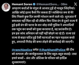 अब सर्वप्रथम राज्य के मुख्यमंत्री हेमन्त सोरेन ने ट्विटर पर क्या लिखा, उसे देखते हैं – “अपहरणकर्ताओं के चंगुल से आजाद हुई, दो मासूम जिंदगियां। आखिर कोई इतना कैसे गिर सकता है? व्यक्तिगत रूप से मेरे लिए पिछले कुछ दिन काफी परेशान करनेवाले रहे। शुरुआत में सफलता नहीं मिल रही थी लेकिन फिर जिस ढंग से दूसरे राज्य में हुई इसी ढंग की घटना के तार जोड़ रांची पुलिस ने अपराधियों तक पहुंच कर बच्चों को मुक्त करवाया है, वह प्रशंसनीय है। हम इस जांच अभियान को यहीं नहीं छोड़ने जा रहे हैं। राज्य एवं राज्य से बाहर घटित हुई ऐसी घटनाओं का गहन पड़ताल करते हुए, अपराधी गिरोह को कमर तोड़ने की कार्रवाई की जाएगी।”