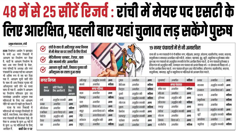 10 जनवरी को रांची से प्रकाशित अखबार प्रभात खबर का प्रथम पृष्ठ का लीड न्यूज देखिये – 48 में से 25 सीटें रिजर्वः रांची में मेयर पद एसटी के लिए आरक्षित, पहली बार यहां चुनाव लड़ सकेंगे पुरुष, जबकि सच्चाई है कि इसके पूर्व भी रांची नगर निगम के मेयर कोटे के लिए एसटी कोटे के पुरुष यहां चुनाव लड़ चुके हैं। यहीं नहीं, खुद प्रभात खबर इस प्रकार की खबरें अपने यहां प्रकाशित भी कर चुका हैं।
